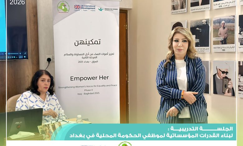 أُقيمت اليوم الثلاثاء 2025/7/15 جلسة تدريبية متخصصة بعنوان ” الخطة الوطنية الثالثة المرأة والأمن والسلام/قرار مجلس الأمن1325 وكيفية ادماجها في خطط المؤسسات الحكوميةضمن نشاط بناء القدرات المؤسساتية لموظفي الحكومة المحلية”،بالتعاون مع امانة بغداد وبتمويل من منظمة نساء من اجل نساء العالم والمملكة المتحدة
